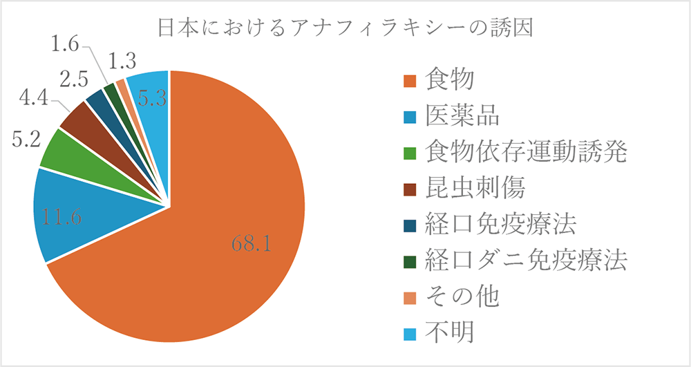 食物 卵、牛乳、小麦、そば、ピーナッツ、木の実類、甲殻類(エビ・カニなど)、魚類 など 小児では食物が最多の原因。 鶏卵、乳製品、小麦、木のみ類が多い