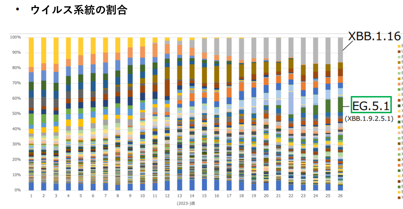 現在の流行株はXBB株がメインとなっておりますが(XBB.1.6やXBB.1.5系統)、XBB.1.5がメインであったアメリカでは、EG.5.1株というXBB.1.9.2の変異株が増加傾向となっており、日本でも緩徐に増加傾向にあるようです。