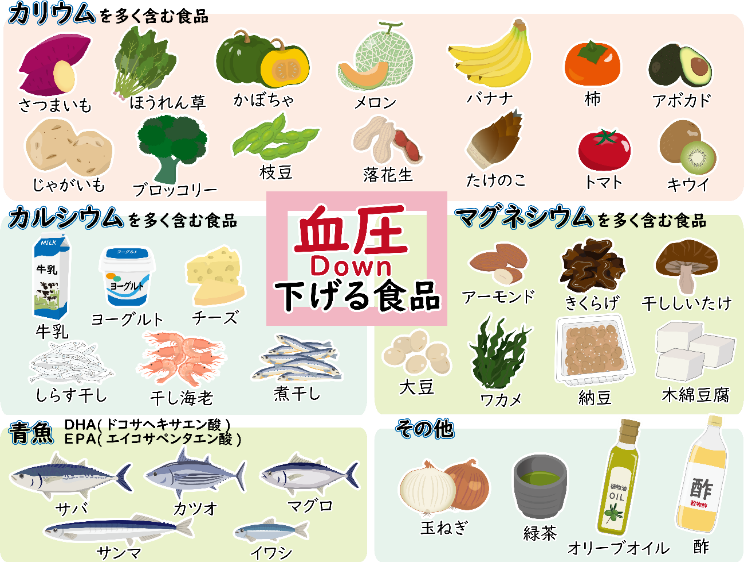 野菜、果物、魚、乳製品なども摂り、たんぱく質、ビタミン、ミネラル類、食物繊維などバランスよく食べましょう。野菜・果物の摂取でカリウムを増やすことは、ナトリウム排泄を促し、降圧に効果的です
